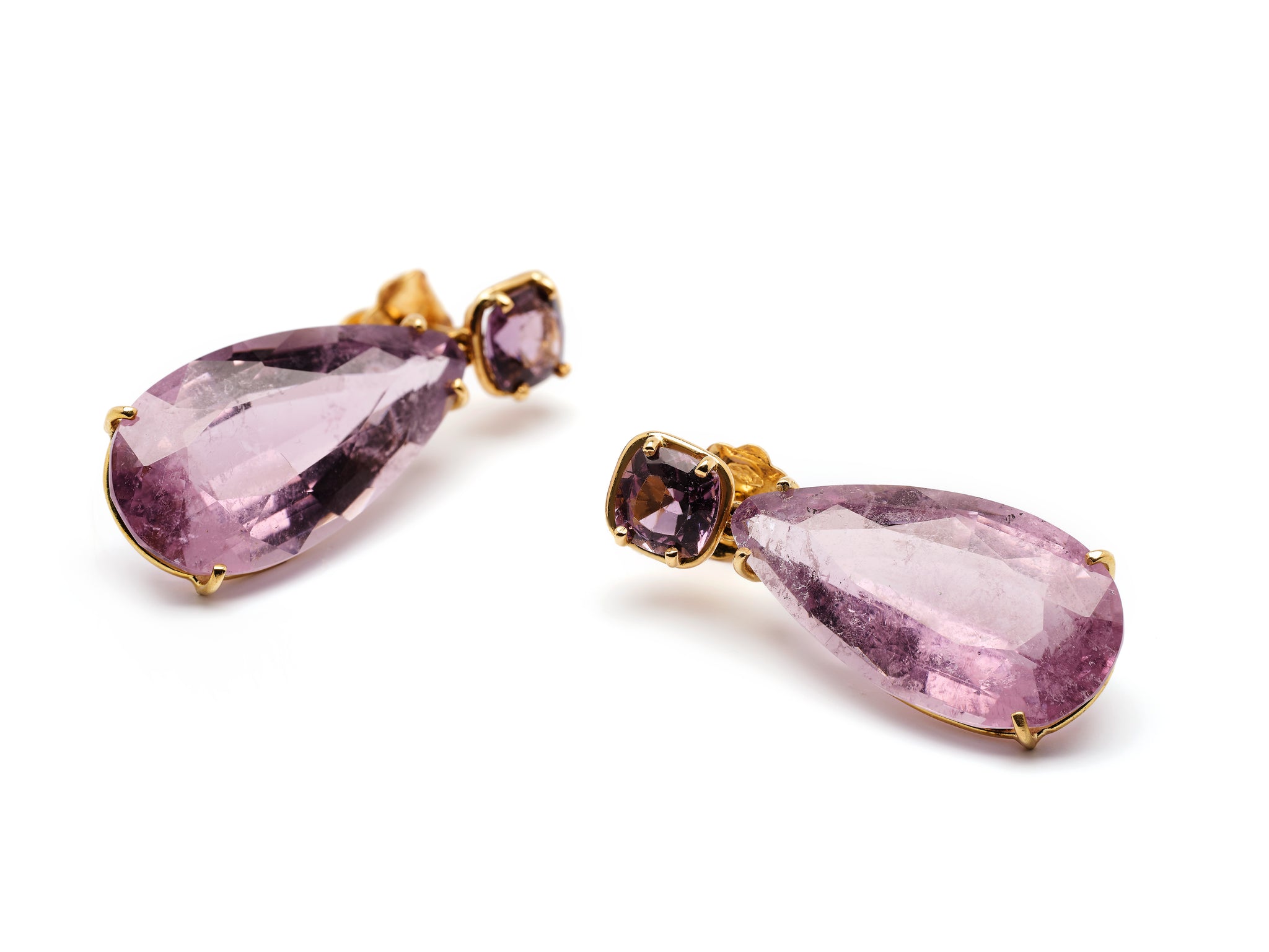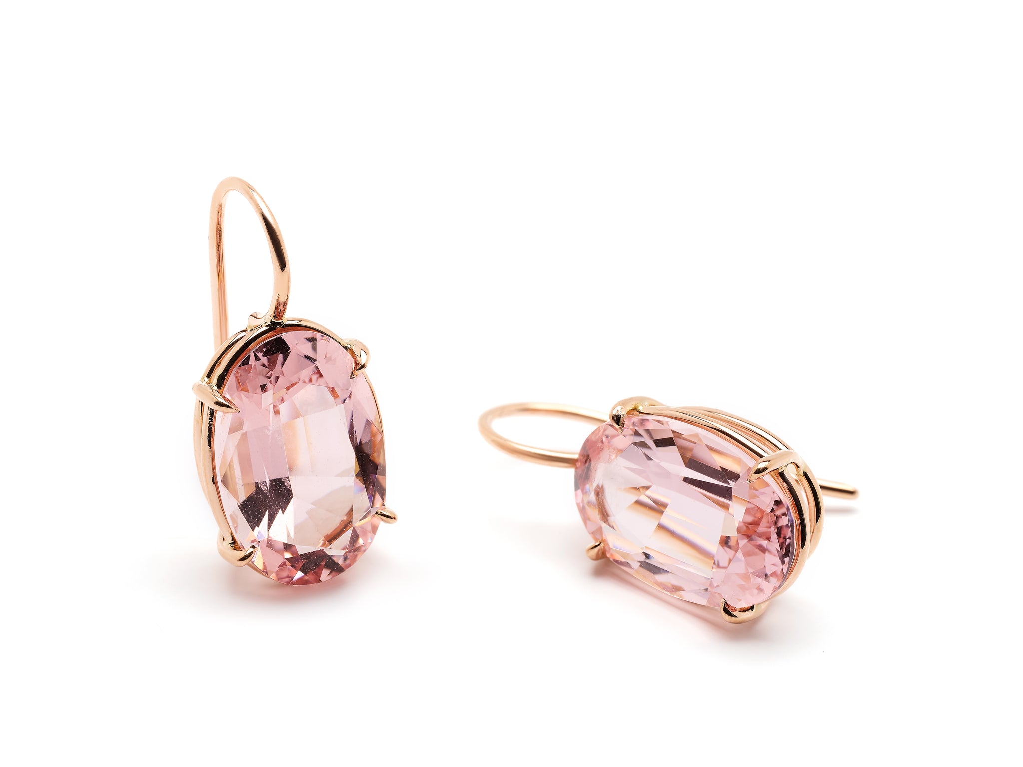 18K red gold earrings set with 2 fancy oval-cut Morganites
