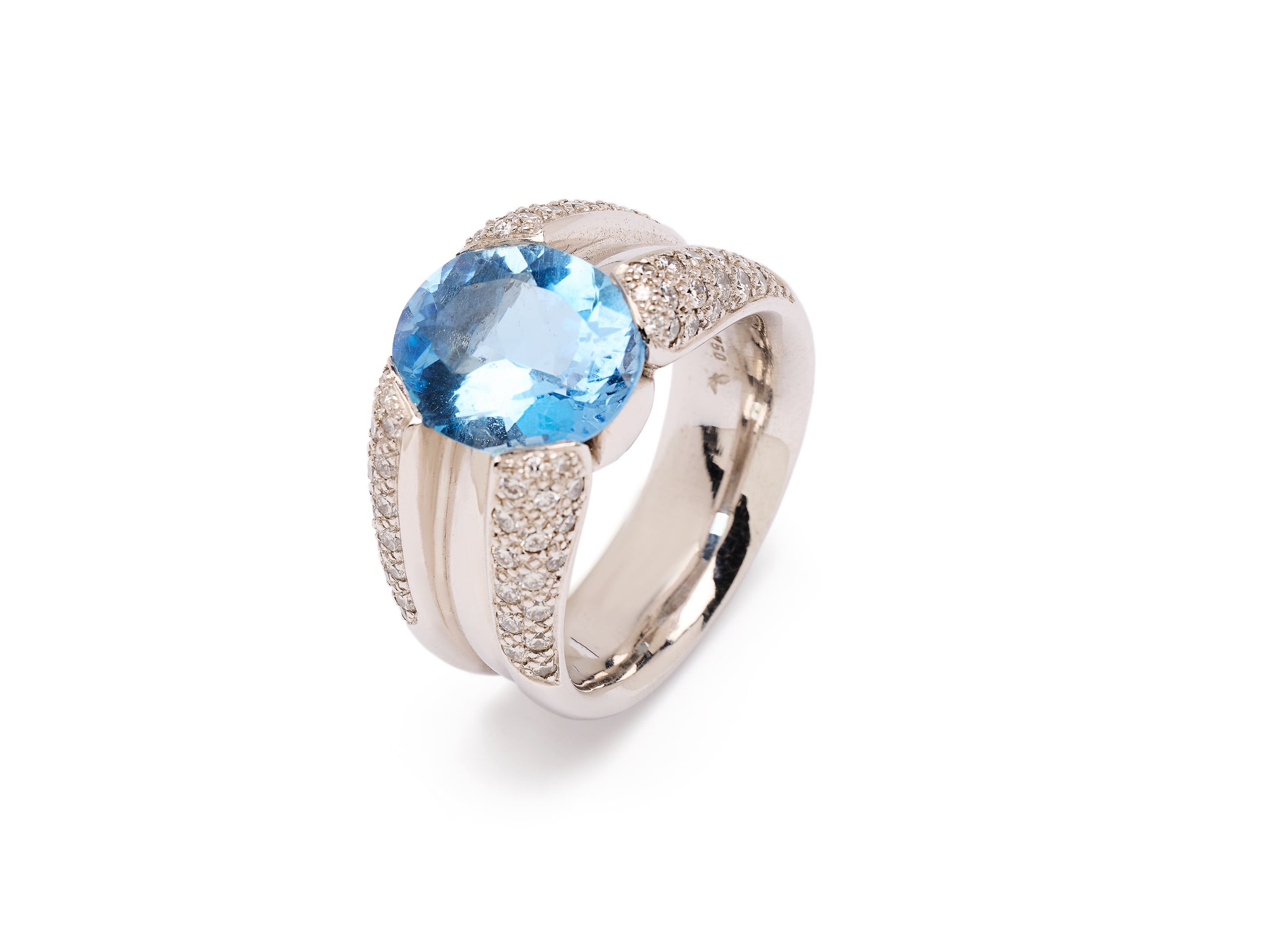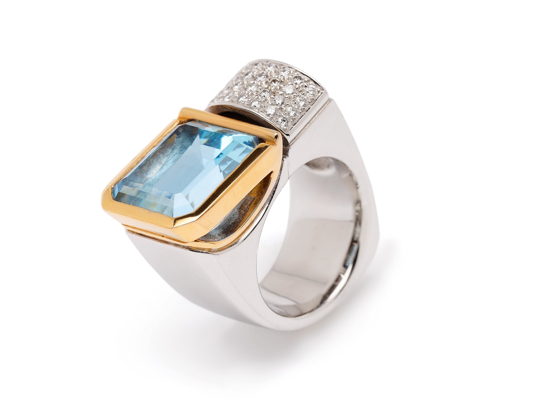 18K white gold/yellow gold ring set with 1 Aquamarine and 28 diamonds