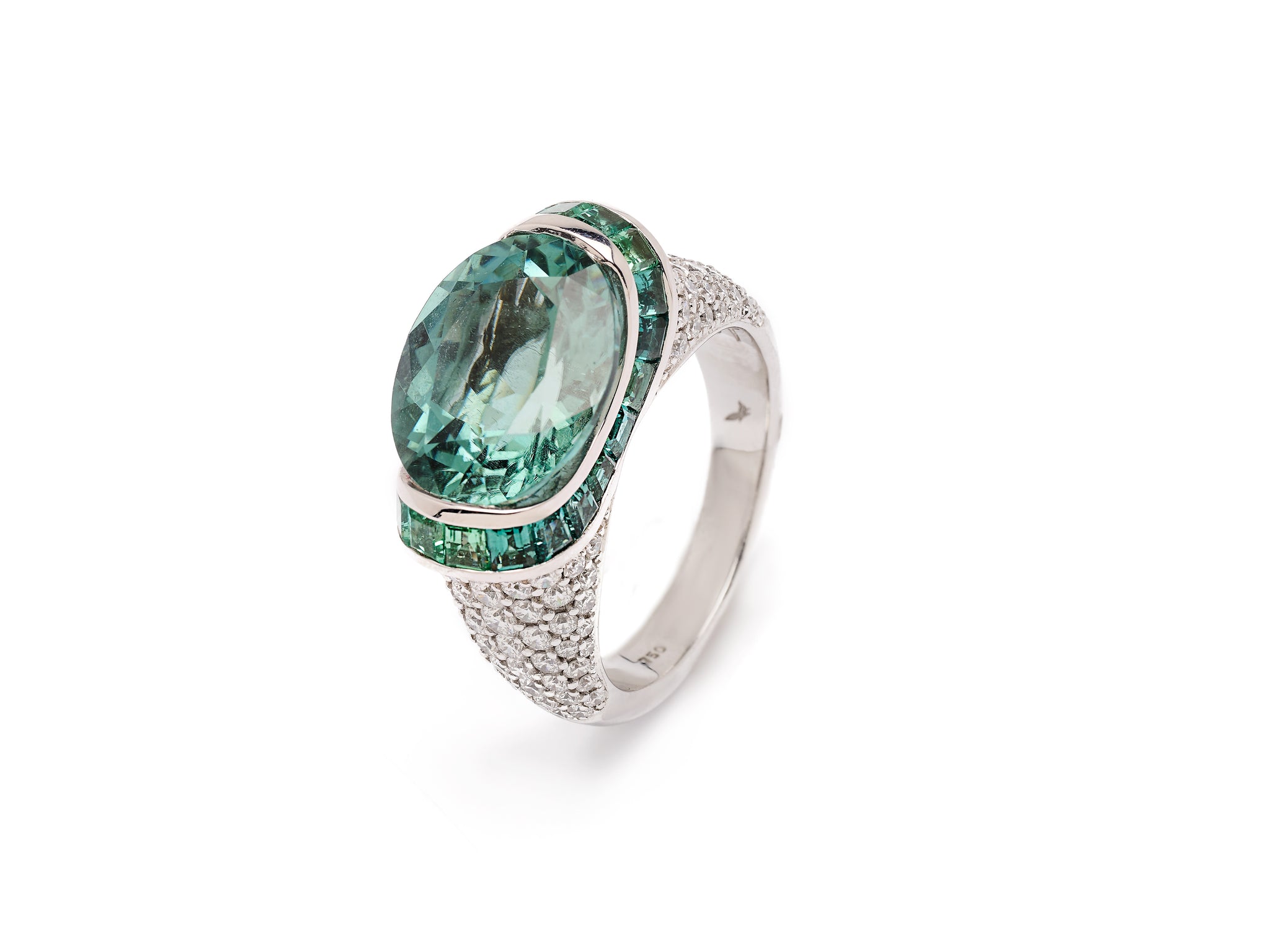 18K white gold ring set with 23 green Tourmalines with 100 diamonds