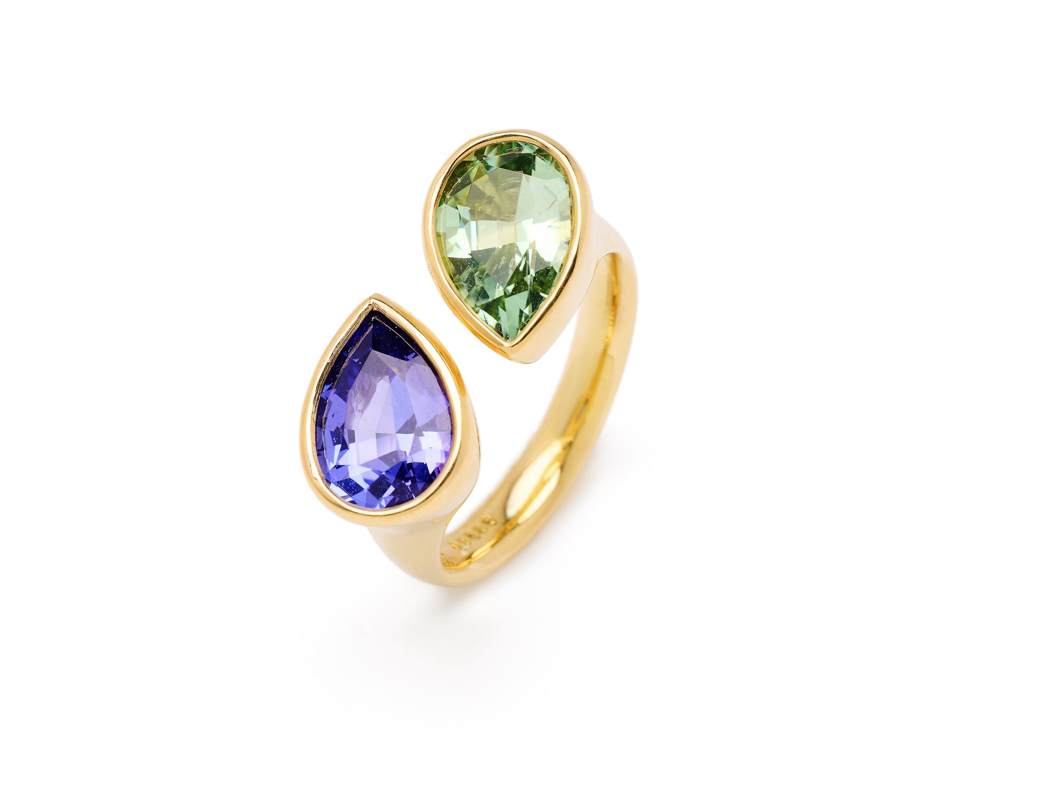 18K Yellow gold ring set with pear Tourmaline and Tanzanite