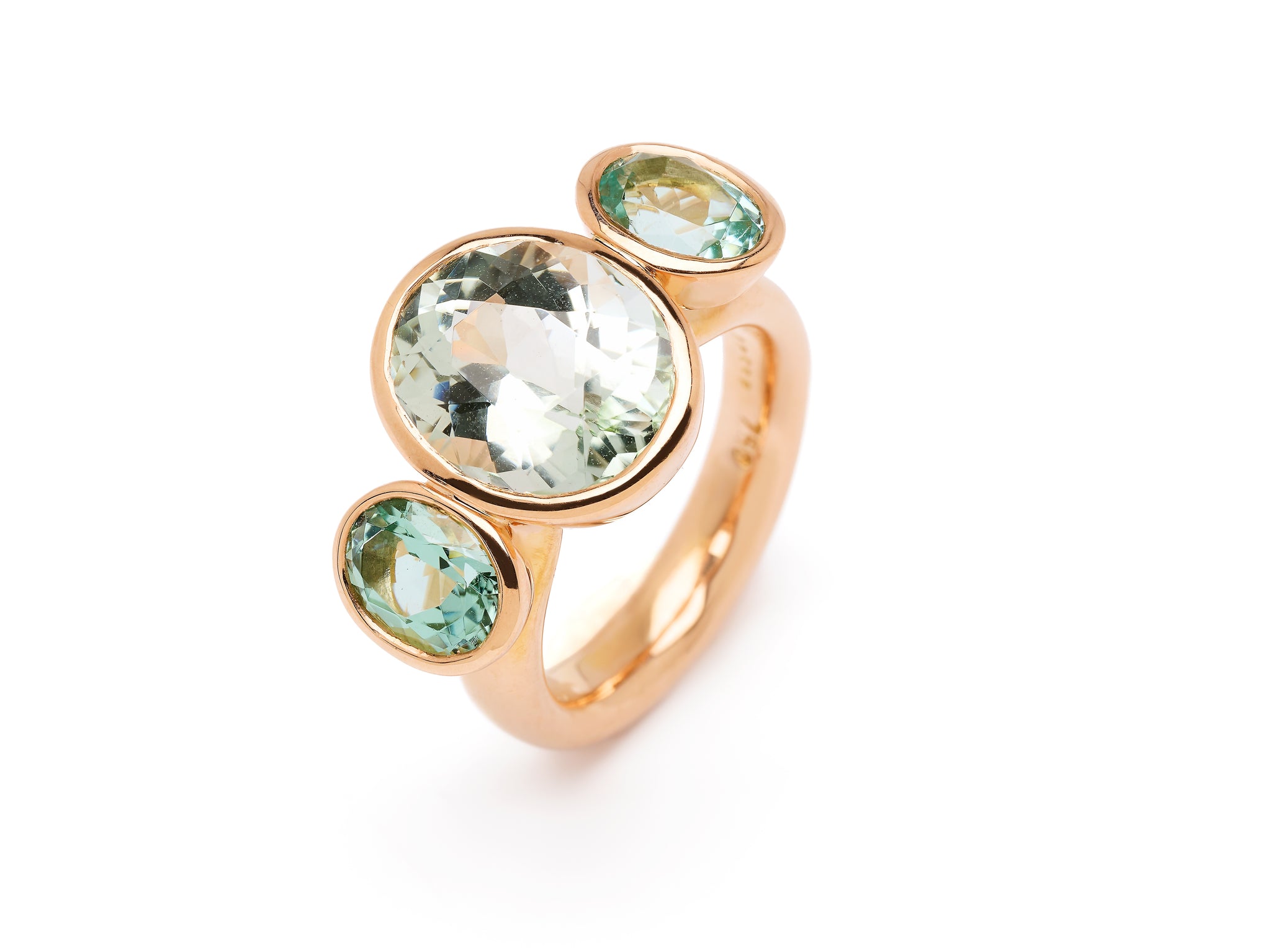 18 krt red gold ring with 3 mint coloured Tourmalines