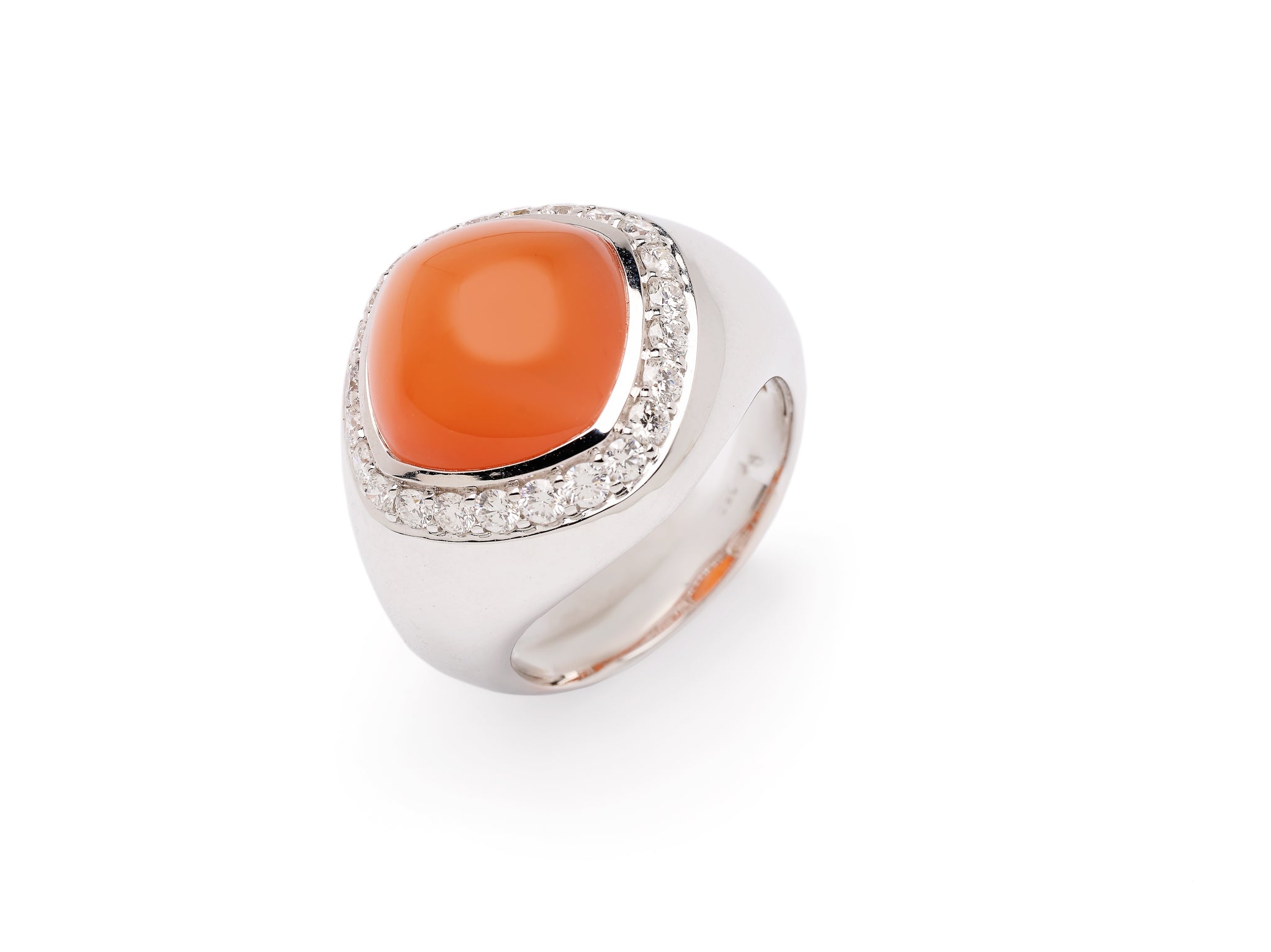 18K white gold ring set with 1 cabuchon-cut orange moonstone