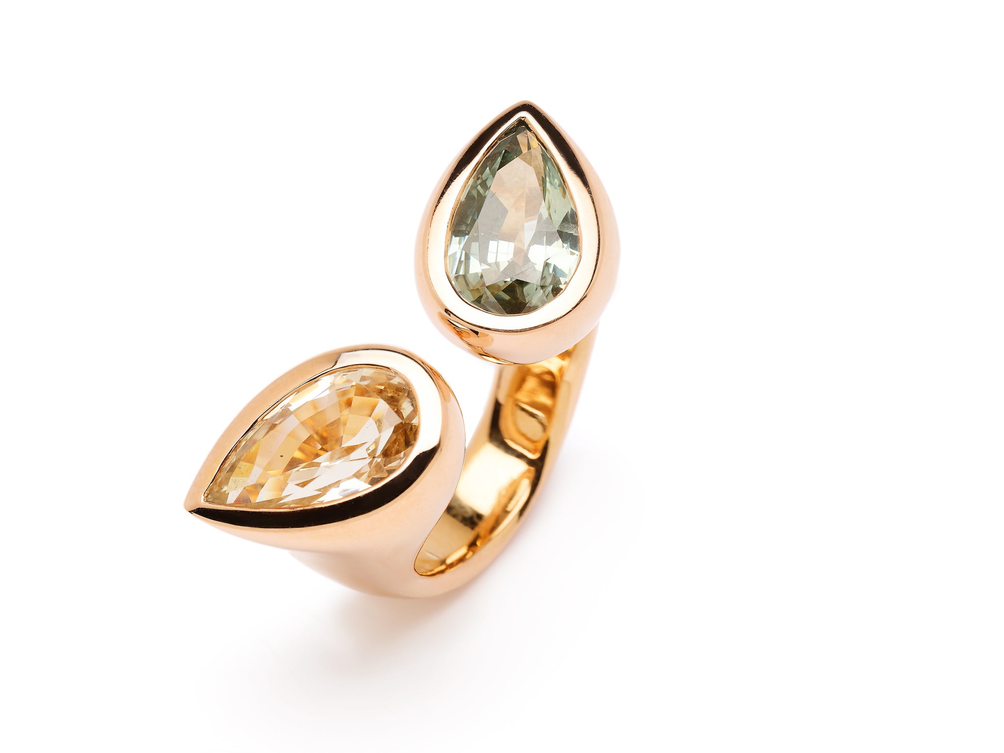 18K Yellow gold ring set with pear Tourmaline and Tanzanite