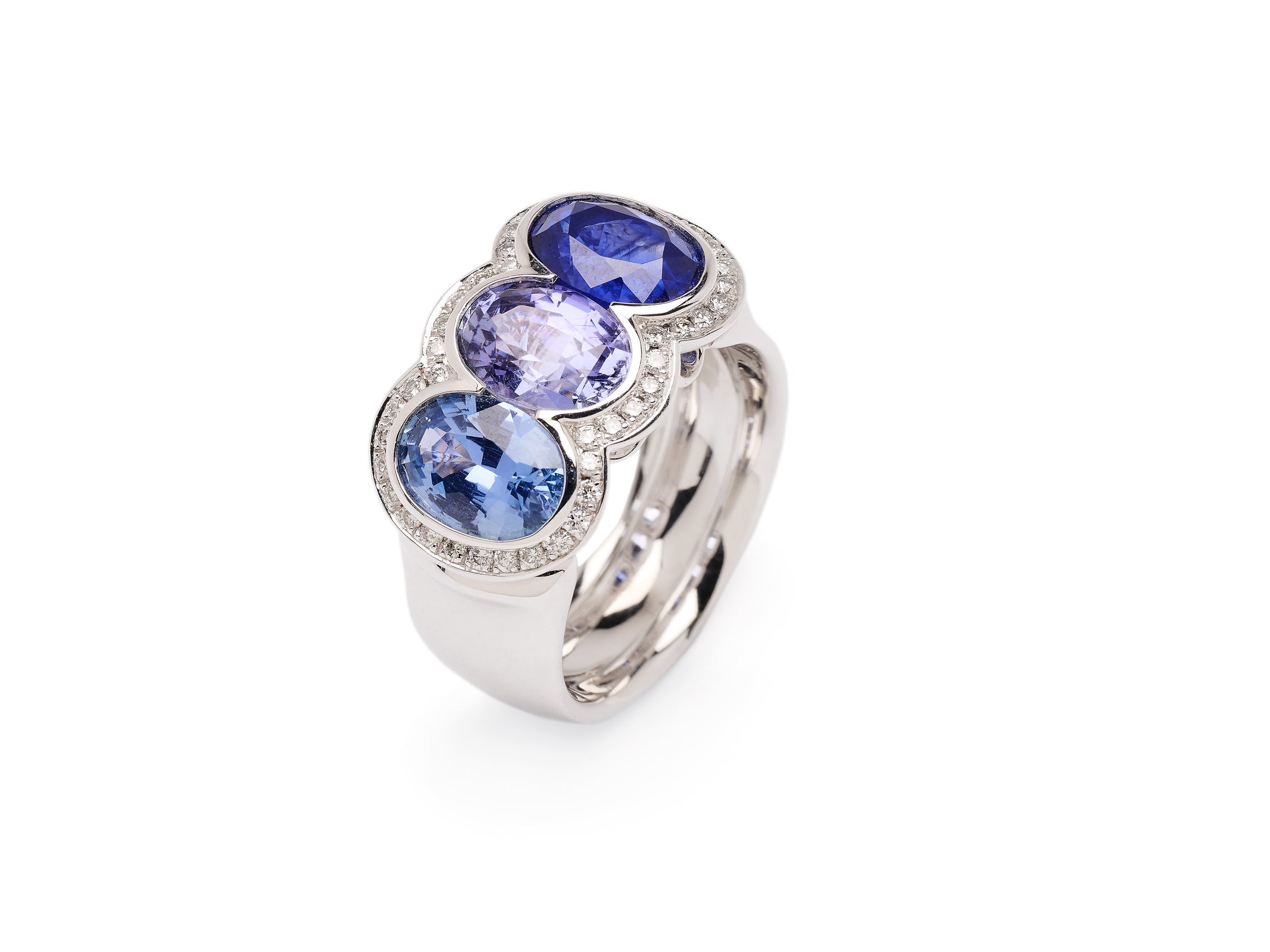 18K white gold ring set with 3 Sapphires and 42 diamonds
